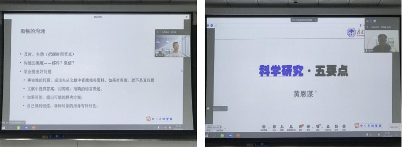 两位老师通过线上与会场同学们进行分享和指导。蔡任栋老师从实证研究的角度出发,向同学们强调与导师的高效沟通的重要性,并提出及时主动与导师沟通、注意沟通渠道和学会提出好问题三个关键点。黄恩谋老师则以科学研究为主题,围绕五个核心关键词为同学们阐明科学研究的要点:观察、好奇心/问题、创新、真理和诚信/伦理。两位老师的讲解简明扼要又诙谐幽默,使得同学们对科学研究有了较为全面的认识并以平常心来面对本科毕业论文写作。