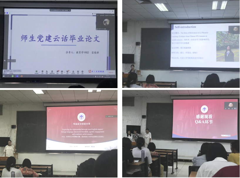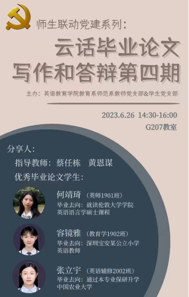 为推进2024届学生毕业论文写作的顺利开展,促进党建工作和教学工作的深度融合,6月26日下午,js3333线路检测中心教育系联手师范系教师党支部和学生党支部于G207教室开展了第四期师生云话毕业论文写作和答辩经验分享活动。本次活动由教育系教师党支部连希博士主持。本次活动邀请了有丰富论文指导经验的蔡任栋、黄恩谋两位老师以及2023届校级优秀论文学生代表容镜雅、何靖琦和张立宇进行经验分享。2020级共两百多名师生参与了此次分享活动,现场气氛轻松活跃。