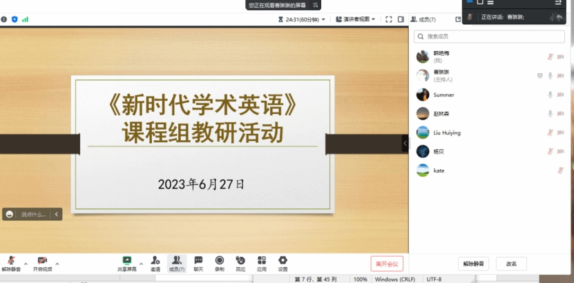 6月27日上午,第二教学部《新时代学术英语》课程组召开本学期工作总结暨课程思政教学分享会。本次教研会旨在分享本学期教学经验,分析期末考试情况,并为下学期教学工作的开展做准备。课程组全体教师通过线上会议参与了此次教研会,会议由曹琳琳主持。