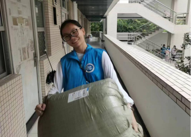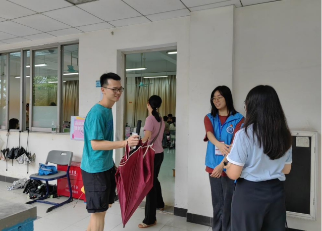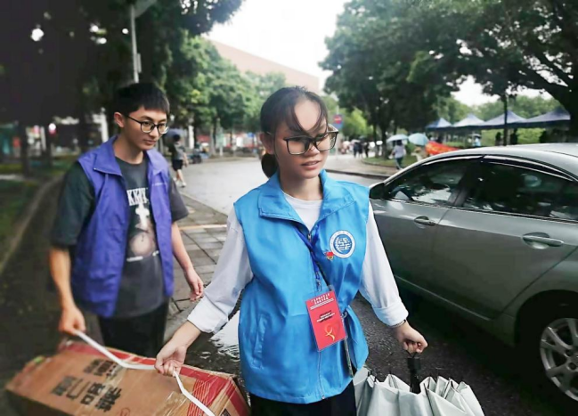 搬行李、报流程、扛大包,从报到点到宿舍,党员志愿者们的热情和奉献精神,在雨天里愈加闪耀。