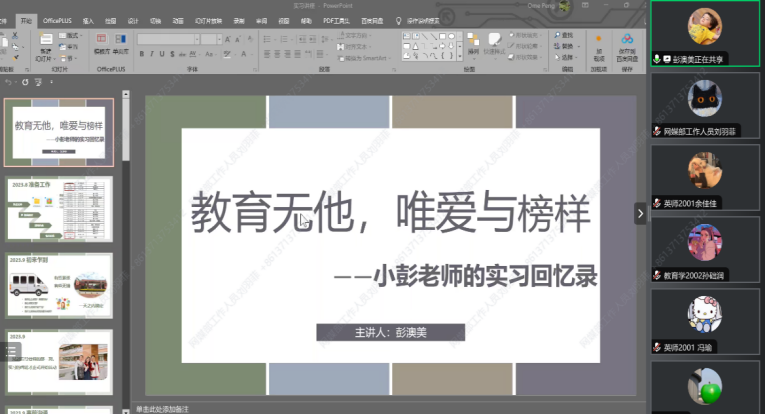 在参与班级管理方面,彭师姐参与了不同类型的工作:主持班会课、组织班干部会议、与“晚修混混”聊天等。彭师姐坚信,要真正融入学生,必须亲临现场、亲身体验。值得注意的是,彭师姐积极参与同学们的校运会,这让她更融入了学生群体,同时变得更耐心和包容。另外师姐分享道,正是因为参与了大量的班级活动,她学会了保持积极的心态应对各种变化,并以此激励师弟师妹们。而在实习生活的忙碌之余,同学们还可以多寻找生活中的“小确幸”以平衡生活和工作。