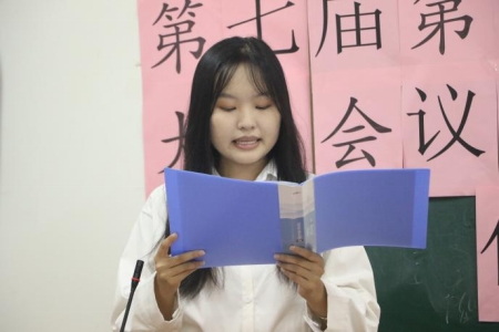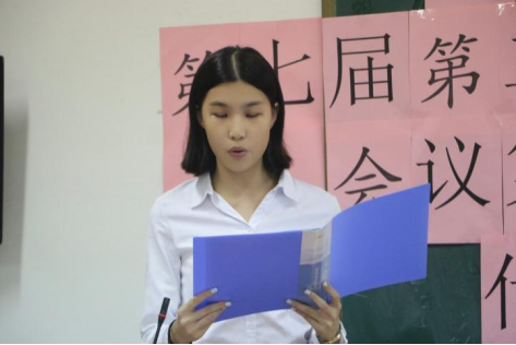 校学生会代表王潇诺对本次大会的顺利召开表示热烈的祝贺,对学院过去一年内围绕思想引领、组织发展、服务青年三个方面开展的各项工作表示肯定,同时她鼓励学生骨干坚定理想信念,铭记全心全意为同学服务的宗旨,倾听同学们的心声,积极创新。她希望学院候选人们不忘初心,在学生工作中有所作为、有所收获。此外,她对支持学生会工作的学子表达衷心的感谢,希望在未来能继续踔厉奋发、笃行不怠,凝心聚力开拓学生会发展新局面,为学校建设贡献青春力量。