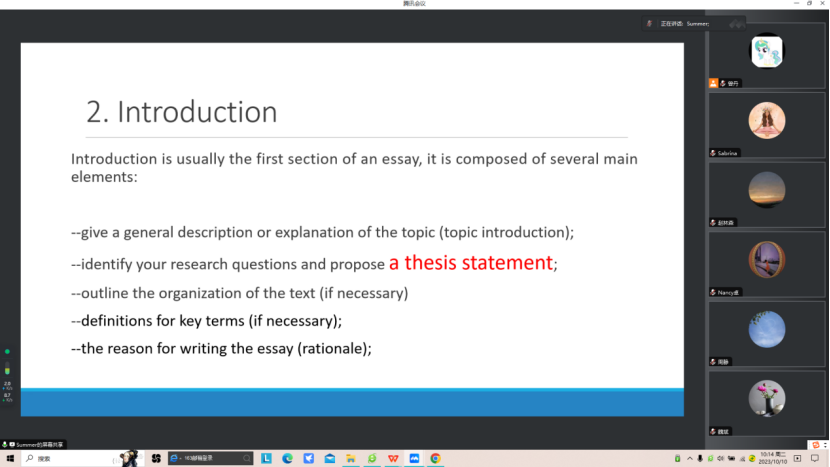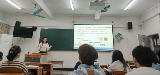 朱三毛老师以《学术英语》课程第一单元中introductory paragraph的写作为主要教授内容,通过文本阅读、教师讲解和音视频的多渠道输入,将学术技能、篇章知识和思政元素完美融合。教学全程互动频繁,学生学习积极性高,课堂气氛活跃。朱三毛老师教态优雅,节奏稳健,教学如行云流水一气呵成,学术技能讲解深入浅出,耐心细致,能引导学生从日常生活出发,探索学术英语技能的内涵。