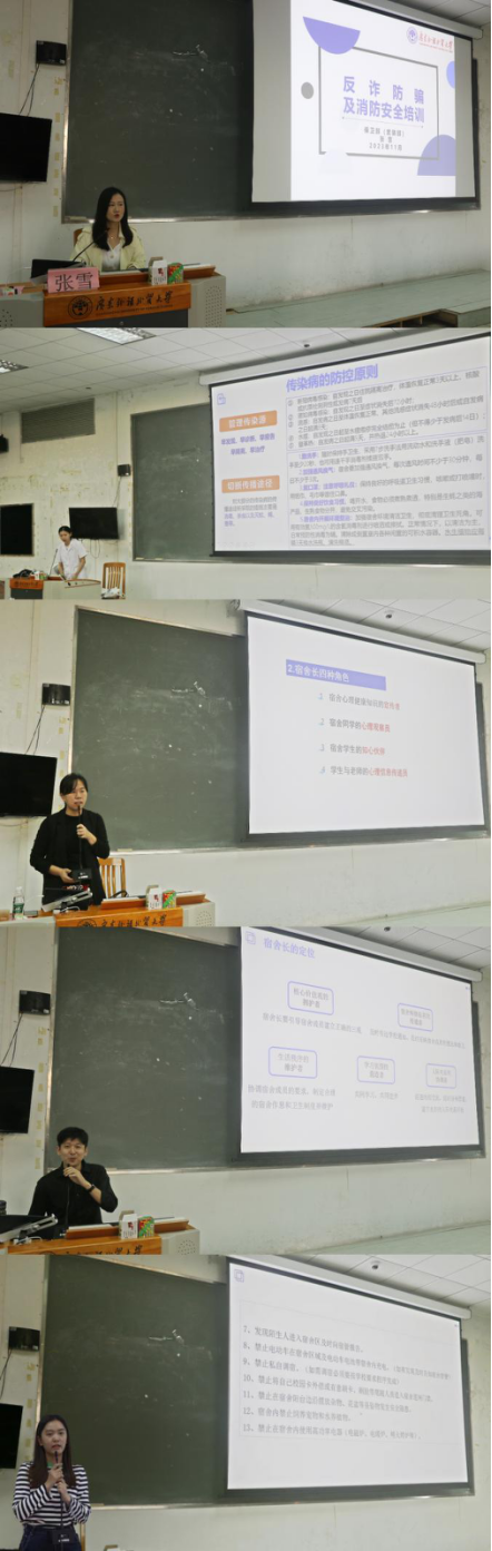 迟殿凤围绕心理健康教育的话题,介绍了宿舍长的职责并强调其重要性。她从实际出发,在心理问题的分类、症状和解决方法等方面强调了心理问题的严重性。同时,她还希望宿舍长应起到示范作用,关注和及时发现身边同学的心理难题和困扰,并给予帮助和疏导。周靖凯从学生社区建设方面详细介绍了宿舍长的角色定位和工作职责,并结合自身经历分享了宿舍管理的方法和技巧。同时,他希望各宿舍积极组织开展文化活动,增进宿舍之间的感情,促进宿舍之间的交流与合作。李敏嘉从公寓文化创建方面向同学们讲解了更为具体的学生宿舍管理须知。她强调宿舍长应当注重宿舍安全,知晓卫生管理的重要性。她从人身安全、宿舍用电安全、反诈防骗安全等方面指出,宿舍长应起到带头作用,加强安全和卫生管理,确保宿舍安全和卫生,遵守宿舍管理规定,共建一个安全卫生和谐的宿舍环境。
