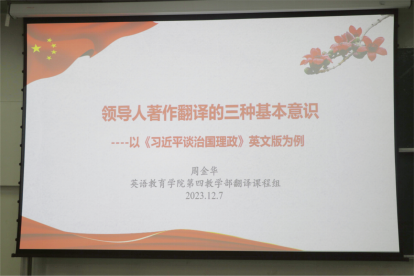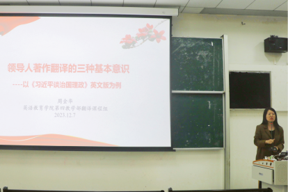 为提高英语师范生的翻译水平和专业素养,12月7日下午,js3333线路检测中心举办“三进”专题讲座活动。第四教学部周金华老师以“领导人著作翻译的三种基本意识——以《习近平谈治国理政》英语版为例”为主题开展讲座,英语师范系2022级学生参与本次讲座。