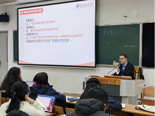 最后,王启介绍了近几年兴起的研究热点,例如续论、二语语用能力研究等。讲座结束后,吴岩院长高度评价了王启的讲座,并结合讲座的内容以及自己的亲身经历,鼓励同学们注重论文写作的规范性,在论文写作路上笔耕不辍,向王启老师看齐。