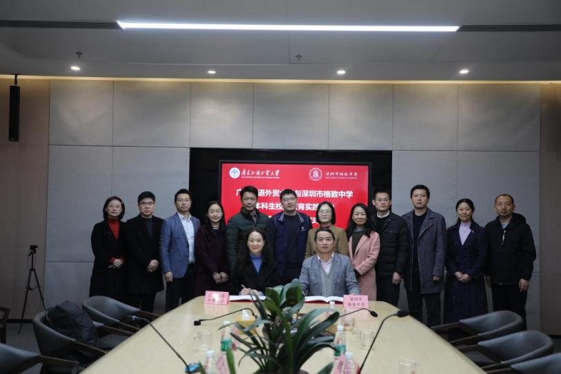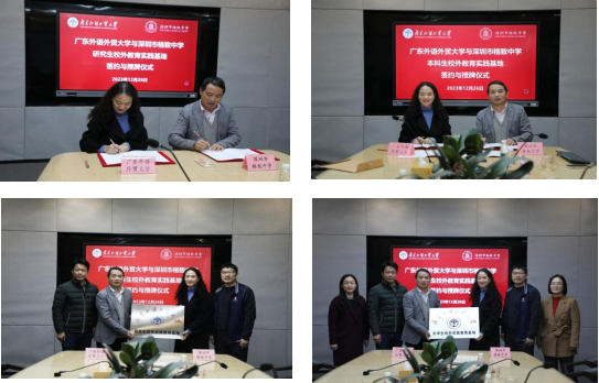在交流环节中,双方就人才培养、实践基地建设、研究生校外导师、招生就业等方面进行了深入探讨和交流。会后,双方共同签署了“广东外语外贸大学研究生校外实践教育基地”和“广东外语外贸大学本科生校外实践教育基地”协议,并举行了授牌仪式。同时,广东外语外贸大学还将聘请深圳市格致中学部分高级职称教师担任专业学位硕士研究生校外导师。