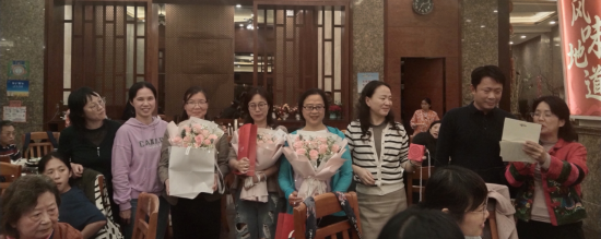 吴岩对退休教师们表示诚挚的感谢,她指出,学院取得的成绩得益于每一位教师的努力,退休教师们在职期间爱岗敬业,培养了一批批优秀学子,在三尺讲台写下了人生追求。希望教师们在退休后能一如既往关心、支持学校工作,并祝愿退休教师们身体健康。骆银花书记、张倩副院长、刘亮星副院长为荣休教师们献花,更献上了学院真挚的祝福。第二教学部曾丹主任和第一教学部李雪莲主任现场朗读情真意切的祝福语。苏春老师献唱,唱出了对荣休教师的不舍与祝福,更唱出了教育情怀的传承。