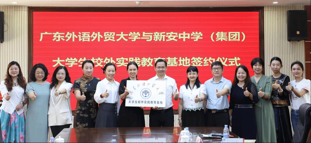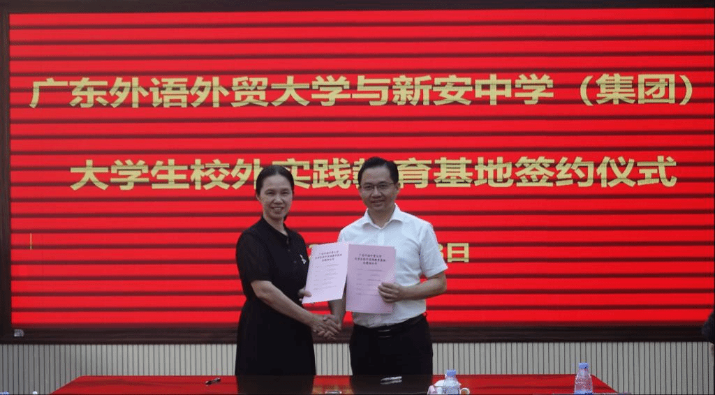 随后,广东外语外贸大学与深圳新安中学(集团)签订了大学生校外实践基地协议,并为实践基地授牌。