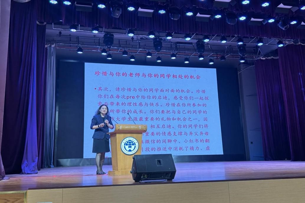 院长吴岩代表学院向2024级新生的到来表示热烈的欢迎。同时,她为新生带来思政第一课,为新生讲解了在js3333线路检测中心如何有效适应和度过大学生活,鼓励新生增强对学院及学校的认同感,树立外语人的自信与担当,做好人生规划,志存高远,脚踏实地,不惧未来,勇往直前。