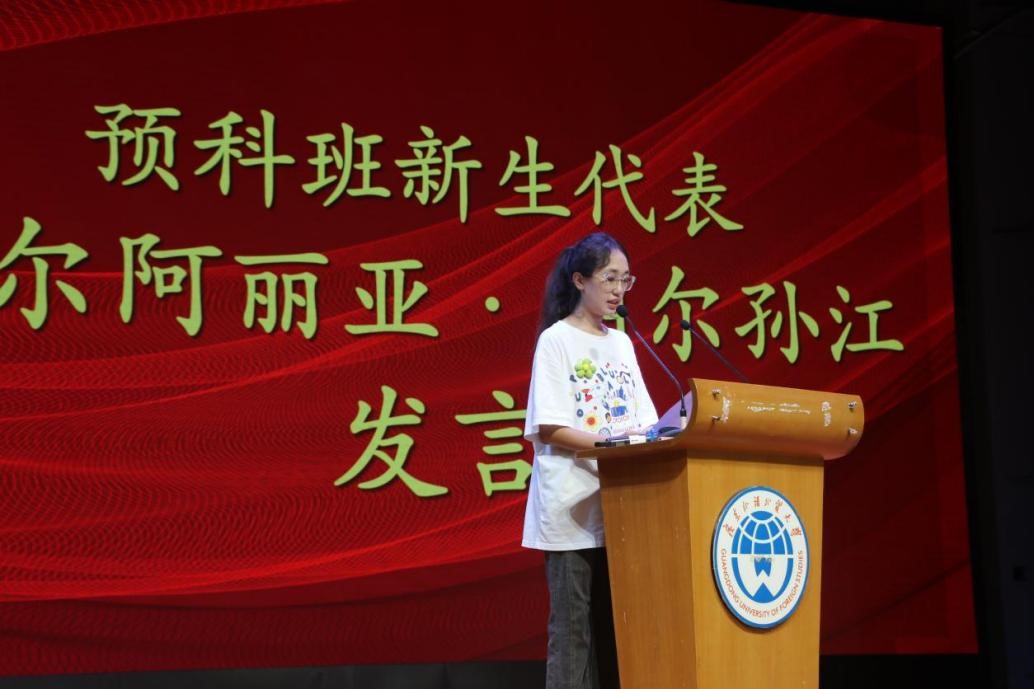 预科班新生代表努尔阿丽亚·图尔孙江代表全体少数民族新生,表达了对学校老师和同学的感激之情。她表示,虽然面对即将开启的大学生活心中既喜悦又忐忑,但她仍将积极面对挑战,与其他民族同学交流互动,为民族团结和国家发展贡献力量。