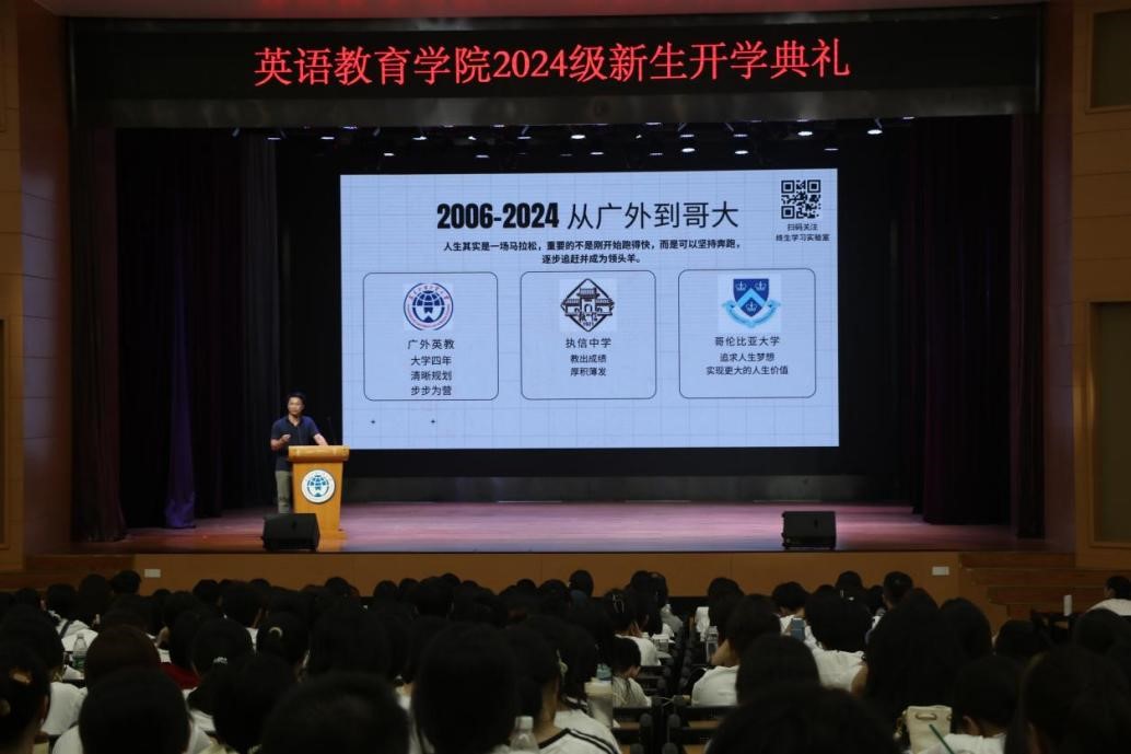 优秀校友代表陈若浩从自身经历出发,分享了他从广外到哥伦比亚大学的故事。他引用“人生是一场马拉松”,鼓励新生“Dreams are made for those who really try”,并希望每位新生将校训“明德尚行,学贯中西”内化于心,外化于行,成为一名优秀的广外人。