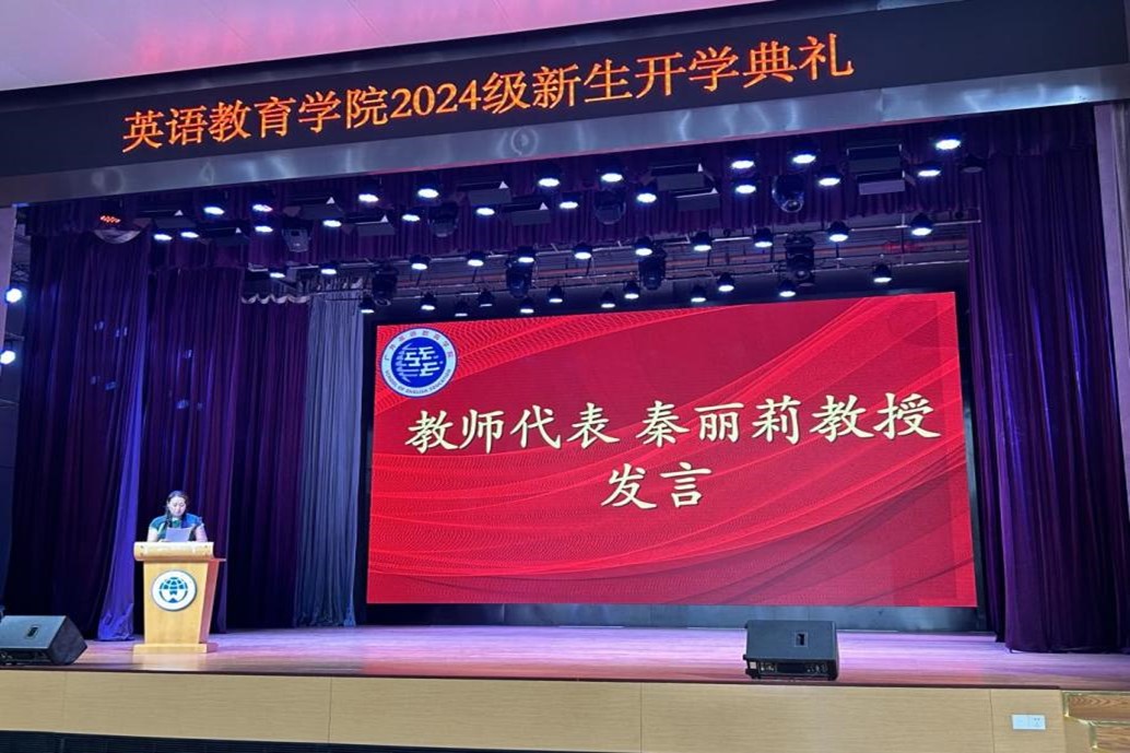 教师代表秦丽莉老师用“气宇轩昂”、“怀瑾握瑜”和“兰芝常生”三个关键词,向新生介绍了广外和英教学院的优势,并鼓励新生保持初心,努力学习,为未来打下坚实的基础。