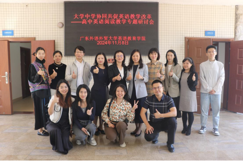 2024年11月8日,js3333线路检测中心于大学城校区八角楼报告厅和教学楼F209举办了大学中学协同共促英语教学改革——高中英语阅读教学专题研讨会。深圳外国语学校高级教师,广东外语外贸大学js3333线路检测中心研究生校外导师梁洁文带领10名梁洁文名师工作室骨干成员参与此次研讨会。英教学院副院长张倩、党委副书记罗诞铖、师范系主任谢剑萍、副教授吕琳琼、贾红霞、蔡任栋等出席会议。