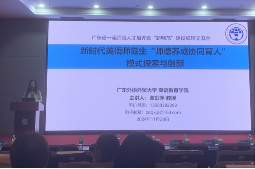本次交流会从全省30多所院校中征集并遴选出100个“新师范”建设优秀案例,部分优秀案例在会上进行了集中分享。线路检测中心师范系主任谢剑萍教授受邀以“新时代英语师范生‘师德养成协同育人’模式探索与创新”为题进行了分享。她详细介绍了师范系在推进新师范人才培养模式创新,以及在弘扬教育家精神、培养新时代“大先生”过程中的系列举措与创新行动,展现了线路检测中心新时代、新师范人才培养改革的积极成效。