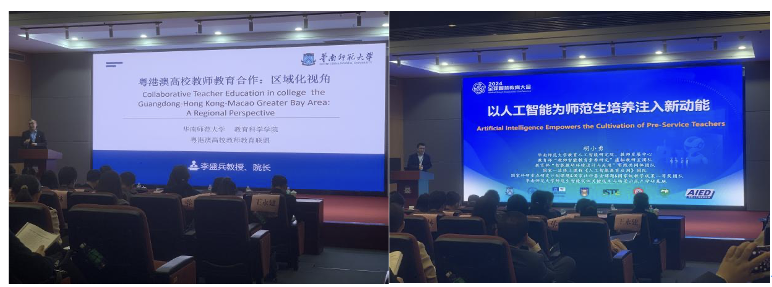 广东省“新师范”建设指导委员会主任委员、嘉应学院校长陈文海教授代表委员会作工作汇报。他介绍了过去几年中委员会在推动广东省新师范制度建设、师范专业认证等方面的工作成效,并提出今后的工作重点将聚焦数字赋能教育、推动合作创新、支持教育决策等方面。在主旨报告中,华南师范大学教科院院长李盛兵教授从区域化视角出发,探讨了粤港澳高校教师教育合作的内涵、机制与未来。他提出要让研究走在实践的前面,优化粤港澳高校教师教育合作的决策体系、组织体系、项目体系,彰显湾区合作的优势与联动发展的红利。华南师范大学教育人工智能研究院常务副院长胡小勇教授关注了人工智能如何为新师范注入新动能。他认为,人工智能带给教育生态的不仅是“强赋能”,也包括“强颠覆”;高校教师要主动把握人工智能教育和教育人工智能的关系,利用好教育数字化带来的教育改革发展的新赛道。