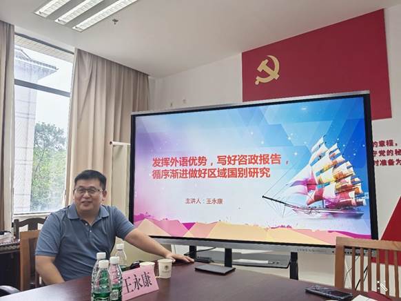 王永康博士以“发挥外语优势,写好咨政报告,循序渐进做好区域国别研究”为题,系统阐述了区域国别研究的理论方法与实践路径。讲座内容涵盖区域国别研究的家国情怀、素养修炼、田野调查、报告撰写和出版发表五大部分。王永康结合自身丰富的学术和实践经验,特别是在非洲孔子学院工作的经验,展示了研究报告撰写的具体过程和步骤,为与会教师提供了宝贵参考。作为非洲研究专家,王永康曾主持多项教育部国别研究项目,撰写的研究报告多次获中央及地方政府采纳。他特别强调,研究者需以“家国情怀”为引领,将语言优势与跨文化素养转化为服务国家战略的成果。