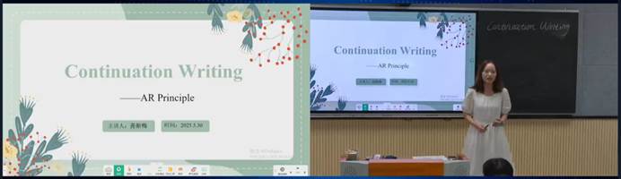 本次研讨的主题为英语续写,尧新梅老师在课例展示中创设学生相处中矛盾的场景,用“动作—回应”原则指导学生建立续写思路,并通过AI视频生成教学资料和写作反馈,引导学生表达对同学间相互合作的赞许。
