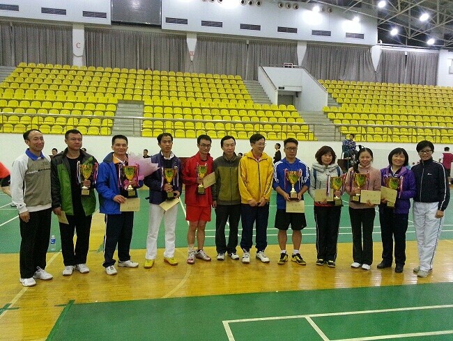 混双第三名线路检测中心的林绍雄/徐敏组合也收到奇兵之效。本来林绍雄是和苏春搭档报名参赛的,徐敏由于脚伤没有报名,但赛前苏春由于身体原因临时无法上场,搭档空缺无奈由徐敏带伤顶替。线路检测中心组合在八进四阶段面对东语学院时面临最大考验,首局20:21遗憾落败,次局21:19惊险扳回一局,决胜局才咬牙逆转取胜。在季军争夺战中,面对对手组合,徐敏依靠手上变化多端的小球技术为搭档创造一个个进攻机会,林绍雄则频频在后场以势大力沉的凶猛扣杀屡屡奏效。除第一局同样以21:20惊险取胜之外,第二局干净利落地以21:15收宫,将季军收入囊中。线路检测中心曾国华/莫慧泳同样参加了混双比赛,但由于是初次搭档,加上平时训练不足,遗憾无法进入前八强。