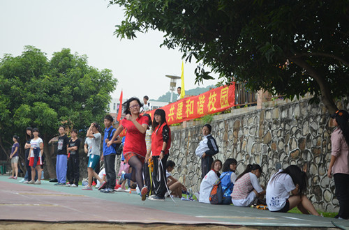 早已在沙驰旁等待检录的男子学生组跳远决赛的运动员们已迫不及待地欲欲跃试,尽力让自己的各个关节都活跃起来,夺取最佳成绩。当然,来自1102班的吴健宽同学也不例外,比赛开始,只见他快速助跑,随即纵身一跃落入沙池,圆满完成了本次比赛。女子组跳远决赛,来自1101班的巫玉蓉同学踏出的每一步都铮铮有力,最后一步的一个腾空,仿佛被定格住,凝聚焦点。