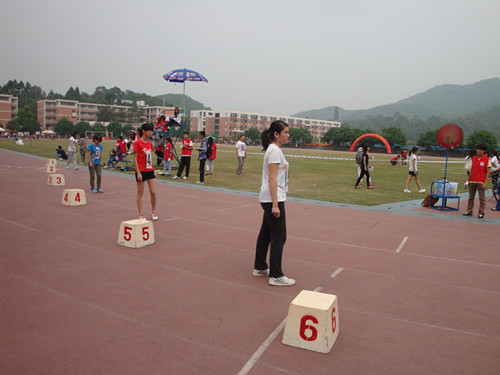 女子学生组三级跳远决赛正在上演,参赛的是来自1204班的庞阿丹和1203班的李富丽同学。比赛开始一声令下,庞阿丹同学三步跳跃,稳稳地落到了沙池里,取得了8.20米的成绩。