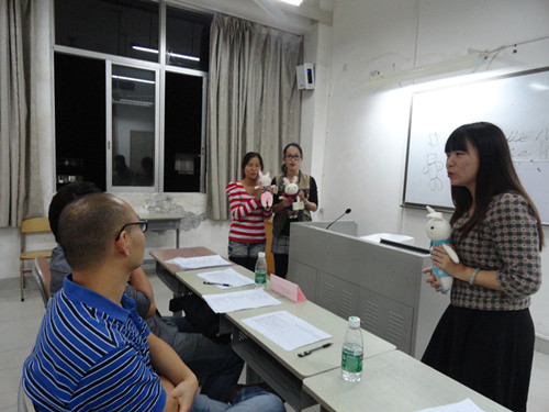 来自1001班的曾秀华同学教授的课程是“四季”,一开始以活泼的舞蹈引入课程,调动课堂气氛,她全程运用流利的英文上课,可见其做了充分准备。来自1102班的陈丹同学全程保持笑容,并结合自制的挂钟上了一堂关于“时间”的英文课。在现场我们特别注意到了一位文静亲切的女孩,她是来自行政管理专业大三的曾晓冬。她的课程是关于物体位置、方向的内容,而她的特别之处在于运用了prezi详细清晰地解释各种位置的英文表达方式,而在评委老师点评时也特别称赞了她对于prezi的新颖的运用。在赛后的采访中,我们了解到因为喜欢教学,曾同学去年也有参加MT比赛,她认为MT比赛锻炼人,自己也能从比赛中学到一定的专业教学技巧。“希望下一年还能参加,假期也会争取实习机会”曾同学说道。