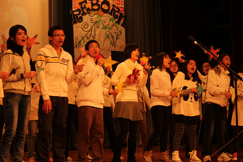 中场互动环节,主持人与大家做了一个猜词小游戏,观众纷纷踊跃上台参与。互动环节过后,晚会的第二部分“浴火重生”开始。英教1201班的同学们为大家呈现上了一台感动与温馨的歌舞剧“大学的那些事儿”,一幕幕情节在诉说着在英教这个家庭里发生所有感动的点点滴滴,而最后的大合唱“你们是我的星光”更是让人倍感温暖。