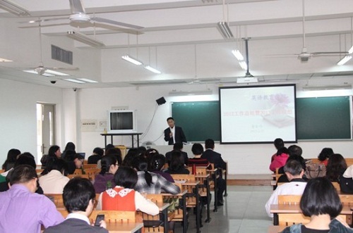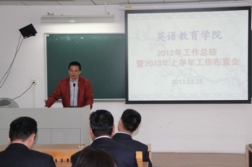 董金伟院长首先就2012年学院在教学、科研、教师发展、社会服务、国际交流、学生管理等方面所取得的成绩做了简单总结,对2013年各项重点工作进行总体部署,特别强调2013版教学计划的修订、申报2013省级教学改革工程项目、第三届“大学英语文化月”活动、第四届“外教社”杯全国大学英语教学比赛、教育学专业学位硕士点申报、2013年TESOL中国年会及第五届全国外语教师发展研讨会等重要工作,要求全院教职工齐心协力,共同把各项工作做好。最后,董院长用“积极进取、努力向上的教师朝气;和谐进步、共创幸福的学院氛围;包容尊重、合作共赢的团队作风;目标明确、团结务实的领导班子”四句话来概括学院的发展优势,同时分析了学院面临的不足,鼓励全院教师树立信心,坚定信念,扬长补短,全方位地促进学院和每个教师全面、健康、和谐、科学地多样化发展。