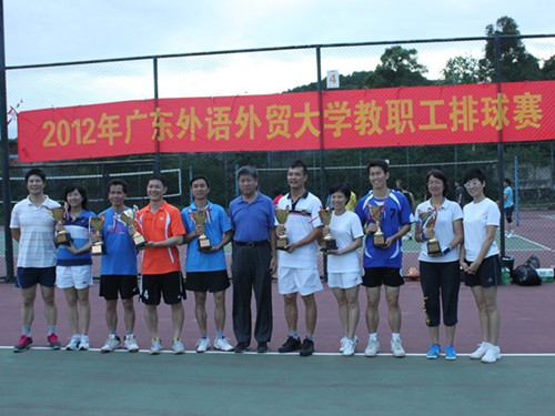广东外语外贸大学2012年教工男女排球赛从6月16日起至6月30日结束,经过多日角逐,线路检测中心和商英学院组成的英教商英联队喜获全校第二名,创造历史最好成绩。