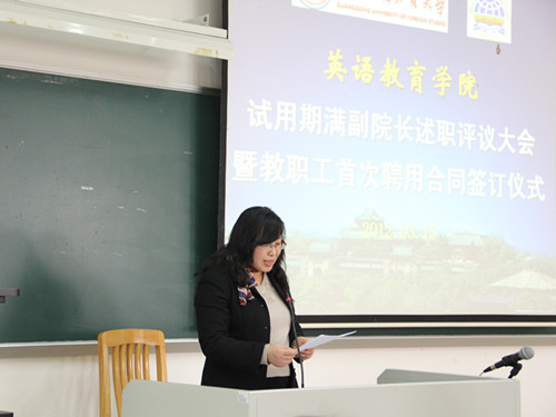 随后,霍海洪给学院全体教职工阐述了关于首次聘用合同签订工作的重要意义。霍海洪指出,教工岗位责任聘任是我校人事制度改革的一项重大举措,聘用合同的签订将更加明确每位教职工的岗位职责,年度评优考核等工作都将与岗位职责挂钩,明确职责,工作才能做到有的放矢,因此,学院全体教职工务必认真对待聘用合同的签订工作。关于教职工首次聘用合同签订的具体规定由董金伟作了全面解读,并从教学工作、科研工作、学科建设、社会服务和其他约定五个方面,分教授、讲师两个等级逐条讲解广东外语外贸大学聘用合同补充协议规定。在首次签订聘用合同的具体操作程序则由曾国华详细说明,要求学院全体教职工按照具体操作程序现场认真完成了首次聘用合同的签订。