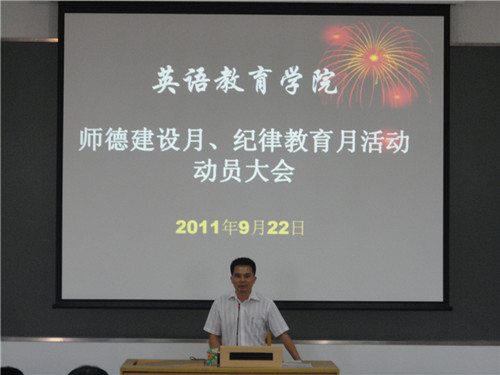 下午两点半,会议正式开始,作为师德建设月和纪律教育月活动动员大会的主持人,党委书记林绍雄首先向在场教职工传达了以“以身立教,为人师表”为主题,以“爱岗敬业,教书育人”为核心的师德建设月精神,呼吁全体教职工认真贯彻国家有关文件提出的教育理念和精神。接下来,林书记向教职工们传达了以“以人为本,执教为民”为主题的纪律教育学习月的精神。他指出,教师是一个光荣而神圣的职业,抓好教职员工职业道德教育和廉洁教育尤为重要;号召教职工们在恪守“学术诚信,廉洁从教”信念的同时,要努力抓好学生的廉洁修身教育,更充分地扮演好自己为人师表的角色。会上还组织了教职工们观看党风廉政建设先进人物事迹的宣传片,帮助在场教职员工进一步感受并学习廉洁奉公、一切为民的精神。