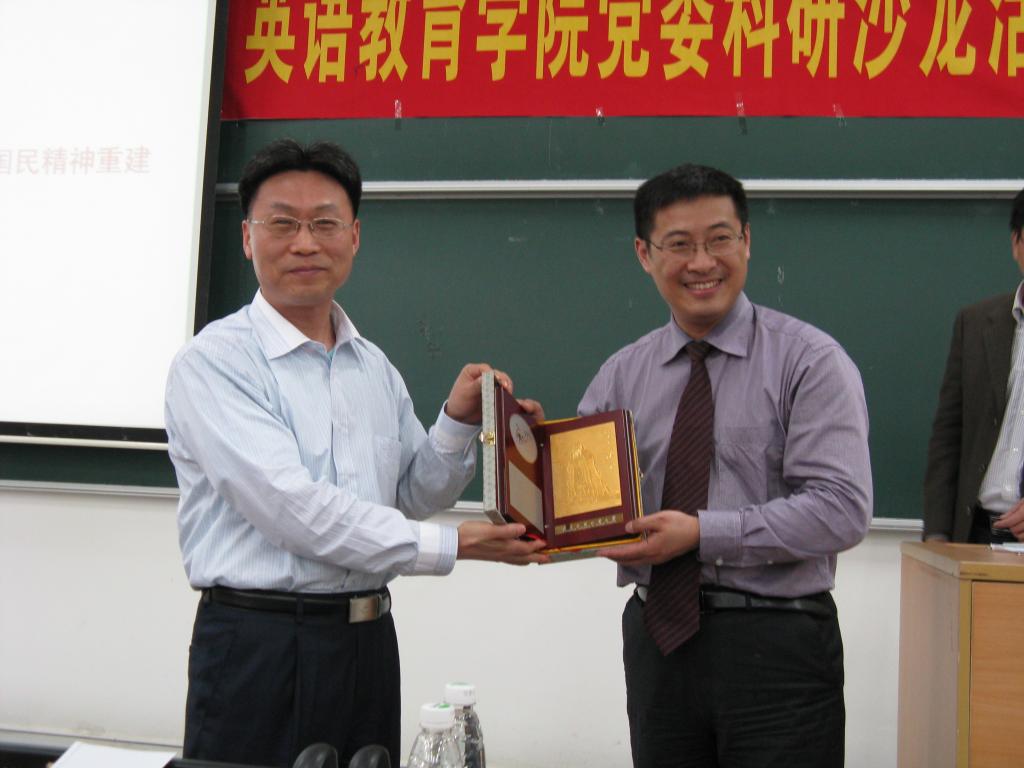 多才多艺的李校长还用动听的歌喉为师生们献唱一首拉丁文歌,博得了在座师生阵阵热烈的掌声。最后,袁长青书记寄语参加沙龙活动的全体师生:“作为一名教师和未来的教师,不能把我们的学生培养成考试机器,而要把培养有自信、有活力、有灵性,有抱负、有情怀的现代公民!”。讲座结束后,教育学院师生就“公民教育”这一主题进行了互动探讨。董金伟副院长代表学院向李校长赠送的纪念品。