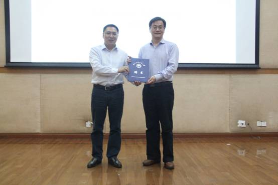 董金伟首先向大家隆重介绍了上海外国语大学著名外语教授束定芳,并由刘海春代表学校向束定芳颁发广东外语外贸大学客座教授证书以及赠送小礼品。随后,束定芳围绕“语言的转喻特征及其对外语教学的启发”的主题进行了精彩的演讲。