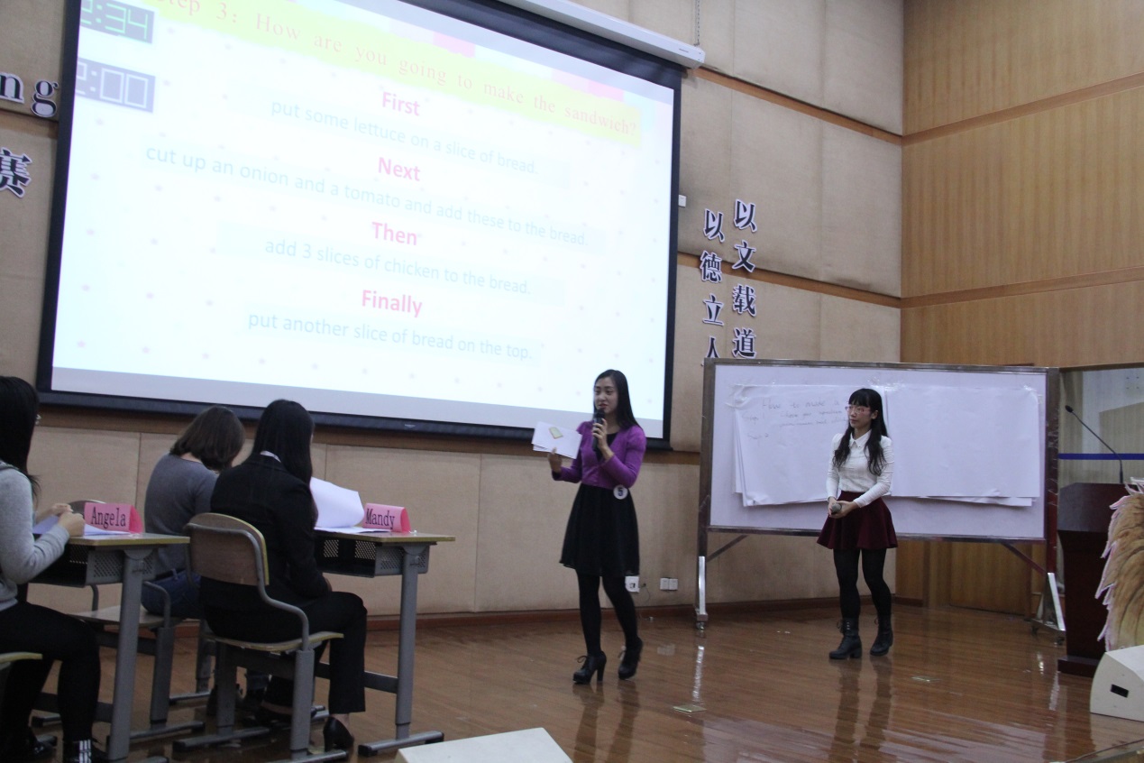 接下来,比赛正式开始。第一组选手吴海云和李诗婷围绕保护环境,与动物和谐相处的主题,以富有创造性的双人合作方式打破传统单人教学模式,并运用教学工具帮助学生更好地理解教学内容。第二组选手林敏瑜在教学中采用游戏马里奥的闯关模式,让同学们在游戏中掌握形容词与其比较级的转换。第三组选手周绮,吴晓青以“What are you doing for vacation”为主题,用国旗与地图展示了世界旅游胜地。第四组选手何宇恒围绕运动的主题,与学生分享了各自喜爱的运动项目,在分享中学习英语形容词,并鼓励学生“Talk more and practice more”。第五组选手林嘉丽,吴子宁以“how to make a sandwich”为题,与学生进行课堂互动,通过课堂小游戏寓教于乐,给评委留下深刻印象。