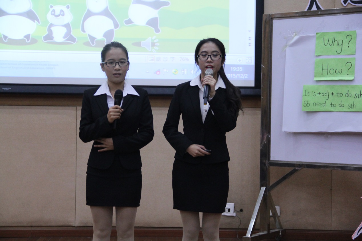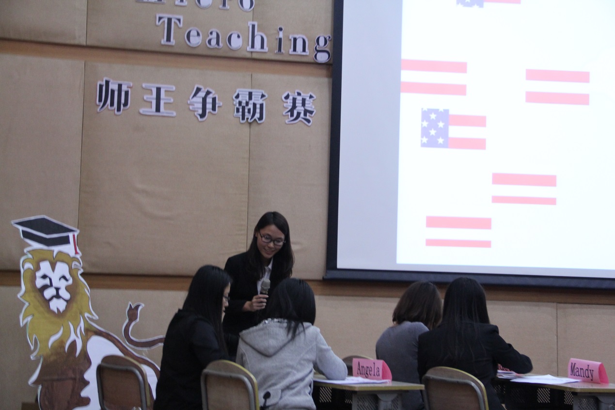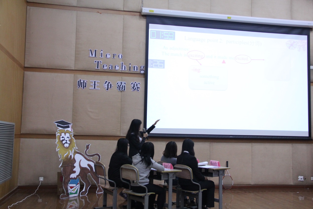 第六组选手林雅洁,黄诗怡以“how do you get to school”为主题,教给学生出行的日常表达。第七组选手黎颖,蔡琬琳手握网球拍在舞台亮相,亲切可人的形象拉近了师生的距离,活泼生动的课堂氛围勾起人们对知识的渴望。第八组选手周冬妮,林苡以小组讨论的形式逐步引领学生做人物介绍,又以歌曲的形式将英文与音乐完美结合,取得了意想不到的效果。第九组选手鲁珊,郑欣强调课堂词汇与对话的学习,提高学生口语能力,让语言真正运用到实践中来。第十组选手夏颖围绕“My dream job”的主题,动员学生帮助卡通人物天天实现梦想的同时,激起了同学们对自身梦想的展望与思考。