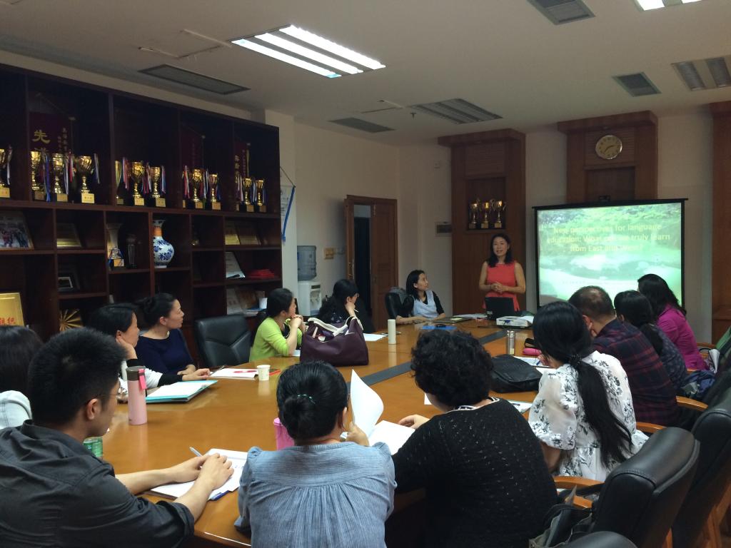 2016年4月21日下午,郑东萍博士系列讲座的首场讲座在院系办公楼245举行,讲座题目为“Ecological dialogical perspectives on language education: Examplesof abductive learning in virtual worlds”。现场气氛热烈,座无虚席,不少我校老师、学生和其他高校老师慕名前来听讲。她首先以在美国为购买衣柜开展的语言交际活动为例,生动地指出了中西方在哲学、语言、语言学习和教育方面的不同视角,同时肯定了中国儒家、道家思想等传统哲学在语言学习中的价值。在此基础上,郑教授详细讲解了EDD (eco-dialogical and distributed)Holistic Ontology理论,并提出Eco-dialogical Model (Zheng,2012)。最后,她演示了一段以ELAN软件处理的Eco-dialogical Model教学模式下学生就虚拟世界游戏展开的交流对话录像,并深入浅出地解释了“manipulative abduction”、“abductivelearning”、“distributed languaging”等概念。在场老师还就自己的研究问题向郑教授汇报请教,老师们对郑教授的精彩讲座充满兴趣,并期待在接下来的系列讲座中继续向郑教授学习。