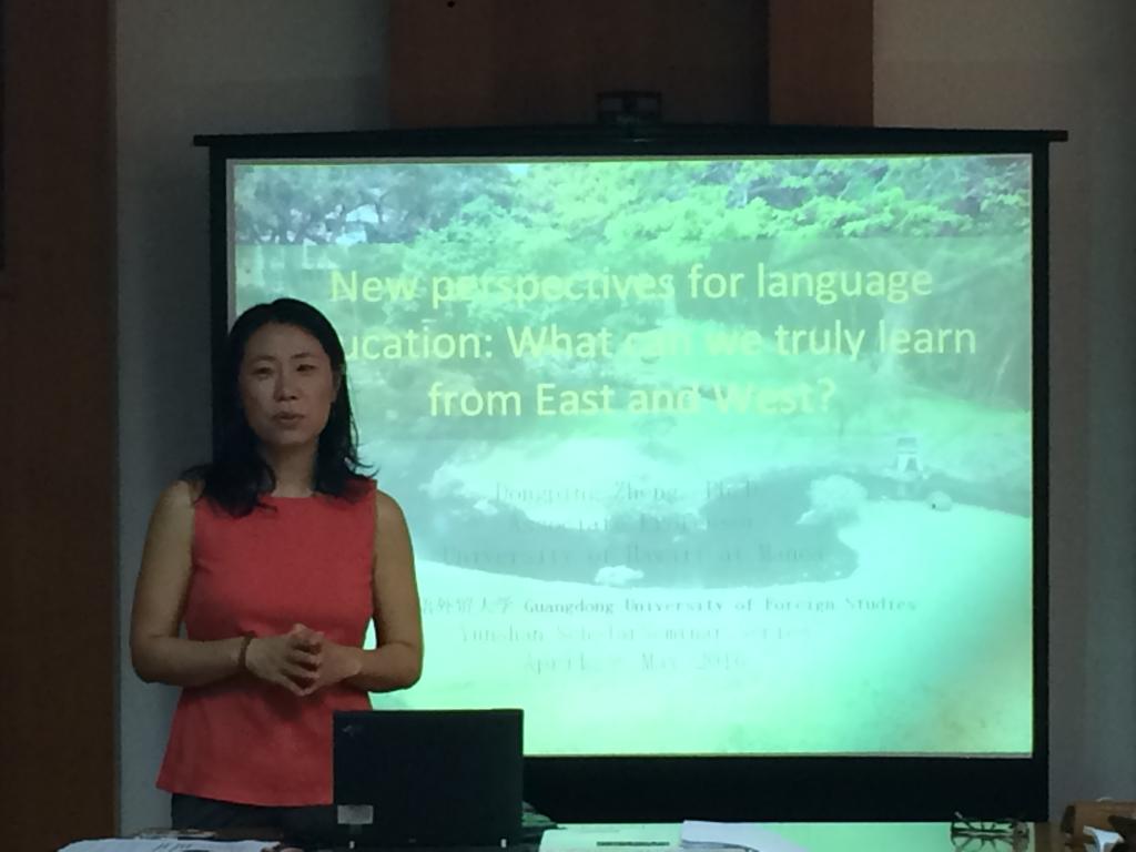 为推动我校英语教师的专业发展,教师发展中心联合js3333线路检测中心近期推出了英语教师专业发展工作坊,邀请广外大云山讲座教授郑东萍博士开展系列讲座“NewPerspectives on Language Education: What can we truly learn fromEast and West?” 郑东萍教授于2006年获得University of Connecticut教育心理学博士,现任夏威夷大学二语研究系副教授。主要研究应用生态心理学,对话学,分布认知及语言来扩张以人为中心的传统二语习得理论。具体课题研究包括虚拟游戏空间环境对语言认知的影响,和以移动无限通讯技术为平台的游戏设计对扩展认知与学习空间,以及社会文化参与于认知的潜能的影响。