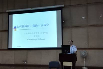 6月22日下午,我校“云山杰出学者”、英文学院魏在江教授莅临线路检测中心,做题为“如何做科研:我的一点体会”的报告。魏教授用深入浅出的方式,介绍了为什么要做科研,把科研比喻为“点、线、面、体”的结合,并指出了当代中国语言学研究的任务和热点议题,包括引进阐释西方语言学理论、在方法和理念上的推陈出新、跨学科和整合性研究、学科内各分支间的交叉整合研究、电子语篇和网络语言研究、把国外语言学理论与汉语研究相结合等。他向在场的线路检测中心教师重点介绍了语言学学术研究如何从理论、方法和材料三方面进行创新。魏教授特别提出,科研和教学之间是相互促进和相辅相成的关系,并强调理论素养在语言学研究中的重要性,指出“不空谈理论”和“不可不谈理论”是两码事。