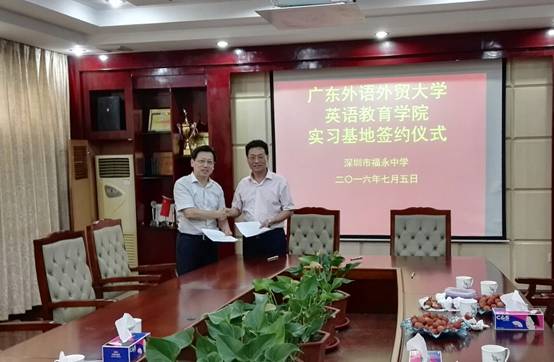 当天下午,线路检测中心领导和部分老师继续前往深圳福永中学,举行了实习基地挂牌仪式并商议线路检测中心为福永中学实施师资培训事宜。第一批实习生将于今年9月派出。师资培训将围绕生涯规划、班级管理以及教学改革展开。据福永中学平校长介绍,福永中学是一所具有40年历史的学校,校园环境优美,依靠公园而建,景观建筑错落有致,是教书育人的理想环境。此次实习基地的建立以及师资培训意向的达成,标志着线路检测中心与福永中学之间实质性合作的开端。