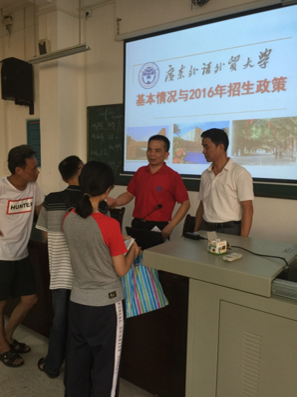 2016年6月25-27日,js3333线路检测中心党委书记林绍雄、学院办公室主任曾国华前往揭阳参加了两场高考招生咨询会,并先后在普宁二中、揭阳一中和揭东一中分别举办了宣讲会,为考生和家长介绍了广外的办学理念、人才培养目标与举措、就业与招生的信息等情况,并就高考志愿填报与招生录取的有关问题与他们进行了分享交流。