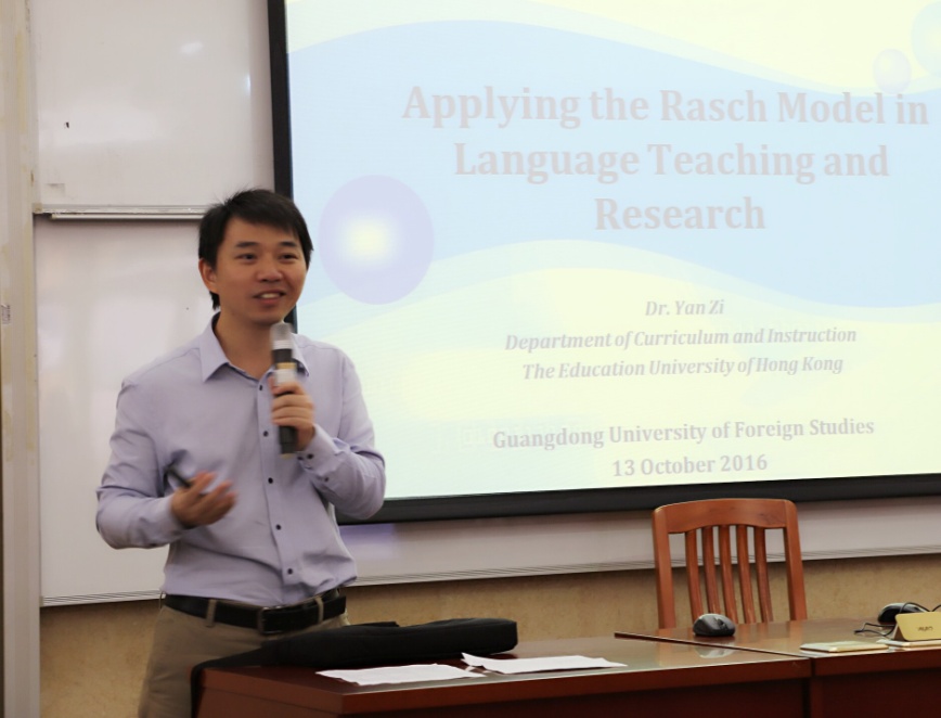 上午工作坊由香港教育大学的晏子博士主讲。晏博士是香港教育大学课程与教学系助理教授,系副主任,同时兼任香港教育大学评估研究中心副总监,以及环太平洋地区客观测量协会副主席。晏博士的工作坊题为《Rasch测量在英语教学形成性评估中的应用》。他提出有效进行形成性评估的一个前提是从评估数据中了解学生的学习状况,从而进行个别化的反馈和辅导。他指出,传统的评估数据分析方法更关注于学生整体的表现而很难提供针对个别学生或个别题项表现特点的信息,而Rasch模型恰恰可以将原始数据处理为可表现个体特征的interval 测量数据。他建议在此基础上再进行其它传统的数据处理。晏博士高屋建瓴的工作坊引起了在座师生对Rasch模型强烈的探究兴趣。