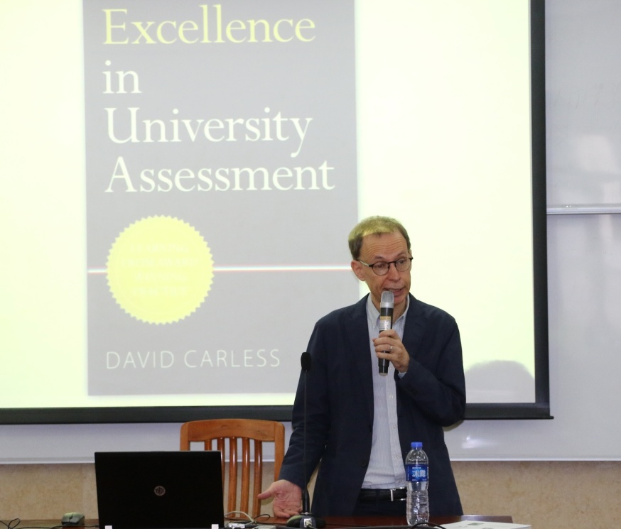 在本次研讨会上,香港大学教育学院的知名学者David Carless教授做了题为“Developing DialogicFeedback Processes through Peer Review”首场主旨发言。Carless教授指出,教师习惯性地担起评估的责任是有待商榷的,教师应该让学生承担起更多的评估的责任。研究发现,学生作为评估者所得到的认知益多于作为被评估者,所以Carless教授建议教师少做一点评估,多一点对学生的评估培训。随后Carless教授介绍了他两位在读博士同时也是教育学院两位优秀教师在广外做的博士研究,印证了教师对学生进行评估培训的重要性,同时也强调教师让学生相信给同伴表现做出反馈的好处。Carless教授深入浅出,将高深的研究化为幽默风趣的语言,引来了听众们一阵阵热烈的掌声。