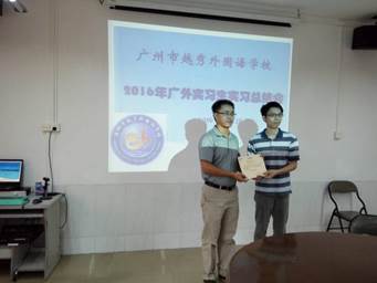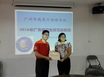10月26日下午,广州市越秀外国语学校为2016年广东外语外贸大学js3333线路检测中心实习生举行了欢送仪式。广州市越秀外国语学校李洪奇校长,钟志辉校长,党委书记陈晓燕,初二年级级长,指导班主任代表,专业指导老师代表,线路检测中心副书记徐昶斌,教育系主任谢剑萍,刘会英主任和三名广外实习生出席了此次会议。