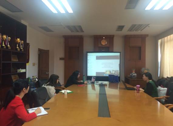 此外,郑东萍教授分别于12月7日和9日上午,与她远在夏威夷大学的研究生通过skype开展远程视频教学活动,主题为:ToolsUsed for Transcription and Quantifying Qualitative Data; Ecological and Sociocultural Approaches to Second Language Learning(ESASLL)。在这次教学活动中,五位研究生依次分享了他们的阶段性课题研究状况,然后由郑教授逐个从学习者与环境互动、研究方法等方面进行指导。线路检测中心多名教师观摩了郑教授的这项教学活动,增进了对夏威夷大学课堂教学、师生交流与互动、研究生培养和研究方法训练等方面的了解,同时,在场老师对郑教授关于虚拟游戏空间环境对语言认知的影响研究表现出浓厚兴趣,并在后续的系列讲座中与她进行了深度交流。