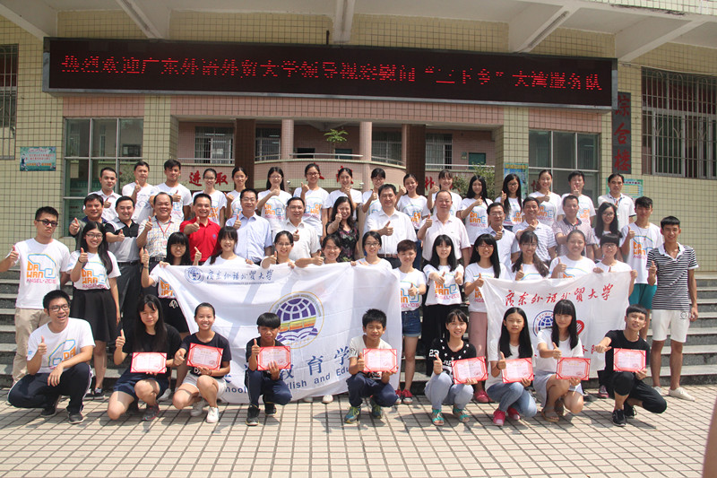 清远英德大湾三下乡服务队组建于2006年,是线路检测中心历史最为悠久,同时也是唯一 一支从2007到2015连续9年获得校级优秀下乡队伍奖项的队伍。11年来,大湾队累计派出超过300名广外英教学院及其它学院的学生前往英德市大湾中学开展义教帮扶活动,服务大湾近1000名学生。学生利用专业优势、结合当地实际,精心策划和安排了一系列精彩活动,赢得了当地领导、教师、学生和家长的高度评价。