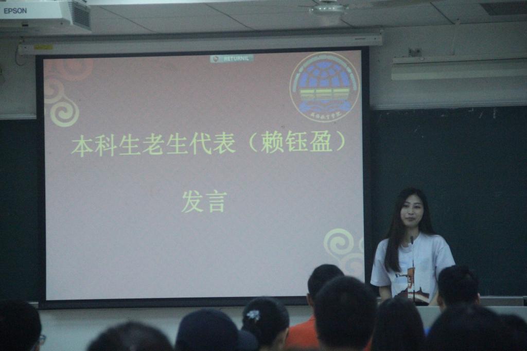 老生代表赖钰莹分享了她的大学情况,大一入学生会,大二当学生会主席,大三当交换生,此后还跨专业读研。她说道,这些在她看来是开始在偶然、微妙的瞬间中得到的成就,其实只是抓住了每一个发现她所爱的机会。她最后谈到,“大学,是用来珍惜而不是惋惜的!”