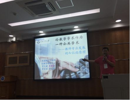 论坛的下半场黄甫全教授首先做了题为“论教学学术作为一种公共学术——教师专业发展的知识论原理”的报告。他首先介绍了公共学术的背景,随后引出教学学术的公共学术整合模型,指出英语学科的价值是在实践中产生的,这是教学学术的知识生成本体论原理。他同时指出要再造教师教育,使专业就是教学,这是教学学术的知识生成方法论原理。最后,黄教授指出,随着学习中心理念的传播,课程教育学知识研究(PCKS)中的“可学性”得到彰显,因此应过渡为课程学习化知识研究(LCKS),这是教学学术的知识生成认识论原理。