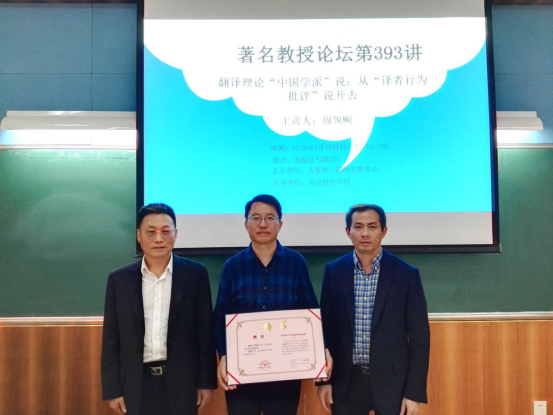 2019年3月14日下午,由人事处、教师发展中心主办,js3333线路检测中心承办的教师发展论坛“著名教授论坛”第393讲在北校区第七教学楼107顺利举行。扬州大学领军人才、二级教授、博士生导师周领顺应邀做客我校,为广外师生带来了一场题为“翻译理论‘中国学派’说:从‘译者行为批评’说开去”的精彩学术讲座。在讲座开始,学院领导受校领导委托,向周领顺教授颁发了广东外语外贸大学客座教授聘书。