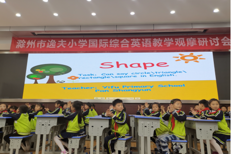 当晚肖建芳、江健两位博士赶赴滁州南谯逸夫小学,参加于31日上午举办的综英教学研讨会。刚开展课题实验不满两年的逸夫小学在徐立保校长带领的综英团队的筹划下,这次采取了不同寻常的研讨形式,即请来了家长观摩综英课堂。一年级老师潘尚运为大家呈现了一堂主题为shape friends的综英课,通过新旧知识的融合滚动,主题活动的层层深入展开,孩子们在老师的带领下能对形状流利描述并完成与之相关的颜色、数量、形状构成的物品的表达。学生不但习得语言知识还锻炼了整合思维的能力。