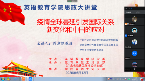 2020年6月12日下午2点30分,js3333线路检测中心云端举办了思政大讲堂的专题讲座,邀请广东外语外贸大学国际关系学院院长周方银教授做了主题为“疫情全球蔓延引发国际关系新变化和中国的应对”的分享。此次活动由js3333线路检测中心党委主办,广东省党建工作样板党支部教育系教工党支部承办,学院各师生党支部协办。学院党委书记杨敏生主持了该讲座,院长董金伟与一百三十多名教职工及一百多名学生齐聚云端。